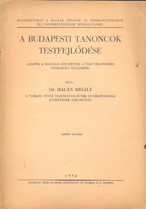 Malán Mihály: A budapesti tanoncok testfejlődése. Adatok a szociális helyzetnek a test fejlődésére gyakorolt ...