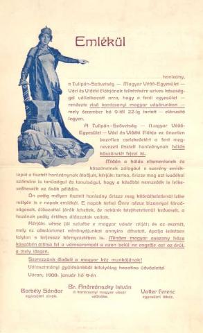 A karácsonyi magyar vásár. A Tulipán-Szövetség — Magyar Védő-Egyesület váci fiókja nagy buzgalommal dolgozik azon, hogy a tervbe vett karácsonyi vásár minél jobban sikerüljön. A vásár helyiségével rendbe jött már az egylet vezetősége, a mennyiben e célra a Kúria vendéglő nagy termét szerződés alapján lefoglalta már. A vásár december 9-étől 23-ig tart. Az előkészítő bizottság tagjai részletesen megismertették a kereskedőkkel és iparosokkal a vásár célját. A kereskedők és iparosok belátva azt, hogy e vásári mozgalom a magyar ipar pártolása címén egyenesen és kizárólag az ő anyagi hasznukat van hivatva előmozdítani, készséggel és örömmel Ígérték meg, hogy csatlakoznak a mozgalomhoz. Sőt tudtunkkal már több vidéki gyáros és kereskedő is fordult már e vásár ügyében az egyesület elnökségéhez. Mi e karácsonyi magyar vásárt nagyon is alkalmasnak tartjuk arra, hogy egyrészt a közönség tettekben pártolja a magyar termékeket, másrészt pedig a kereskedő világ anyagi kockázat nélkül hathatósabban vegyen részt a magyar ipar termékeinek forgalomba hozatalával. Itt adjuk közre azt is, hogy az e vásárt előkészítő bizottság tagjait a további részletek megvitatása végett f. hó negyedikének délutáni három órájára hívta össze az egyesület elnöke az ő lakására. Külön meghívó nem küldetik, ezt szives figyelembe ajánlja az elnökség. /Váci Hirlap 1907. nov. 3. / 87. szám /